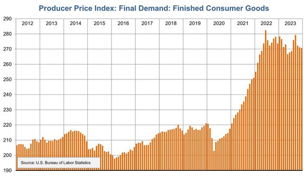 While the Consumer Price Index (CPI) seeks to measure prices paid by consumers for products and services, the Producer Price Index (PPI) seeks to measure prices paid to producers for their products and services. The Producer Price Index (PPI) is actually a family of several thousand indexes and sub-indexes generally grouped by Industry, Commodity, or Stage-of-Process. Perhaps the most closely watched PPI is the Finished Goods Price Index, often used as a leading indicator of changes in inflation as measured by CPI. This chart illustrates monthly, seasonally adjusted index growth from January 2012 through December 2023. Source: U.S. Bureau of Labor Statistics